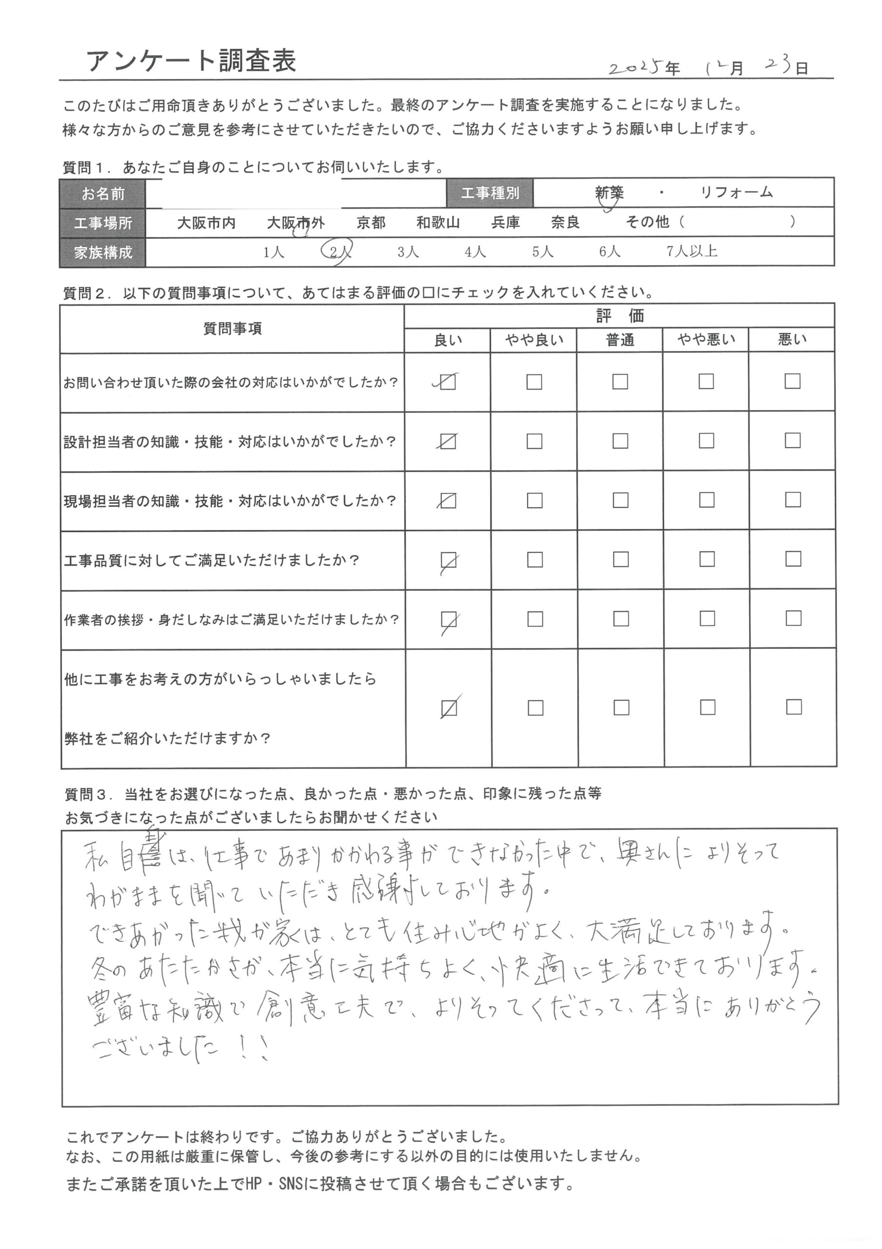 泉佐野市にて新築注文住宅をお引渡し頂きましたお客様から
